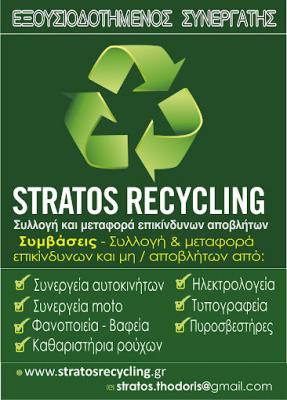 Η εταιρεία STRATOS RECYCLING είναι αδειοδοτημένη εταιρεία και σας παρέχει άμεση εξυπηρέτηση πανελλαδικά με σεβασμό προς τον πελάτη και το περιβάλλον στους παρακάτω τομείς: Περισυλλογή και μεταφορά επικίνδυνων αποβλήτων σε: Συνεργεία αυτοκινήτων Συνεργεία μότο Φανοποιεία – Βαφεία Καθαριστήρια ρούχων.
